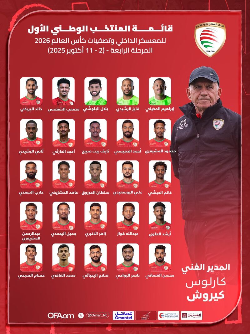 اختار المدرب البرتغالي كارلوس كيروش المدير الفني لمنتخبنا الوطني قائمة اللاعبين للمشاركة في المعسكر التدريبي الداخلي قبل أيام على انطلاق المشاركة في المرحلة الرابعة من التصفيات المؤهلة لكأس العالم 2026.