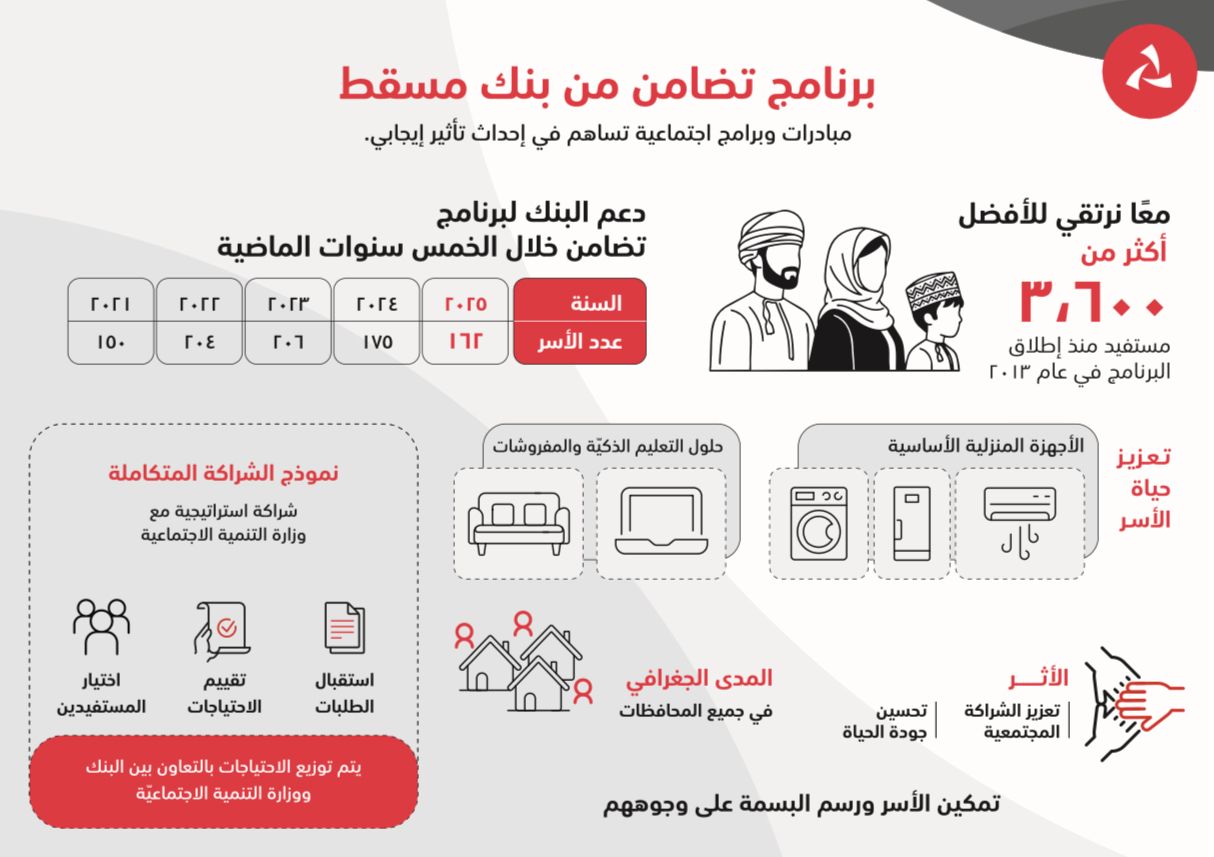 تماشيًا مع رؤيته الرامية إلى تحقيق تنمية مجتمعية شاملة ومستدامة، يواصل بنك مسقط، المؤسسة المالية الرائدة في سلطنة عُمان، تنفيذ سلسلة من البرامج والمبادرات الاجتماعية التي تهدف إلى إحداث تأثير إيجابي ملموس في حياة أفراد المجتمع من مختلف محافظات سلطنة عمان، مع التركيز على خدمة مختلف الشرائح.