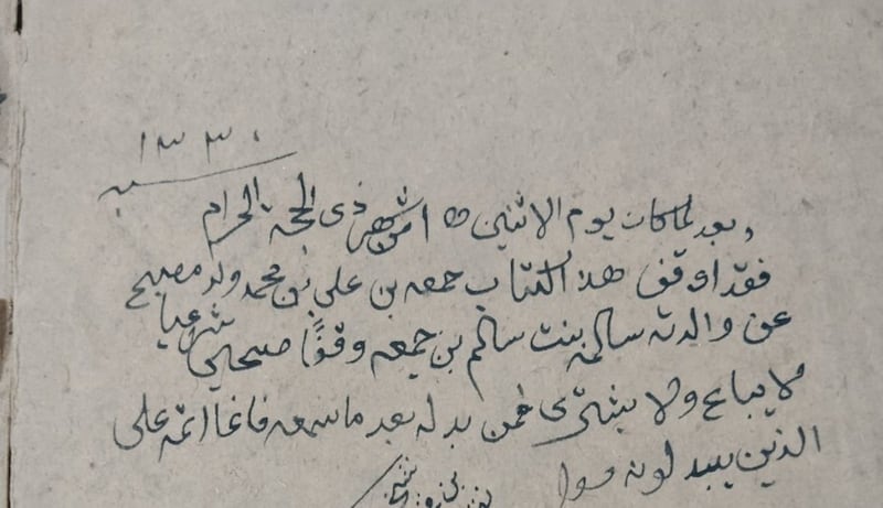 ومن الشواهد الدالة على ذلك تقييدٌ يعود إلى عام 1331هـ، أوقف فيه الشيخ جمعة بن علي ولد مصبّح العريمي أحد كتبه عن روح والدته سالمة بنت سالم الحشّار العريمي، في صورة تعبّر عن التقاء البرّ بالوالدين بالعناية بالعلم، وجعل الكتاب صدقةً جارية.