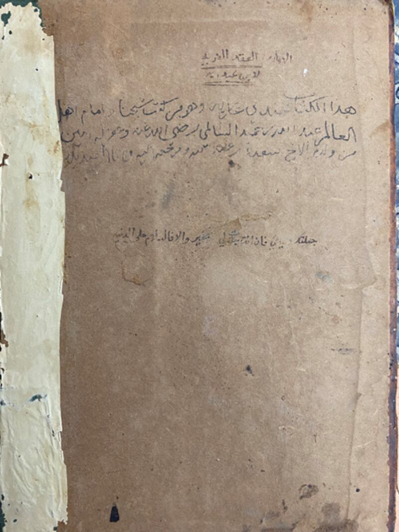 ومن النماذج اللافتة التي وقفنا عليها نسخةٌ من كتاب “العقد الفريد” كانت في الأصل ضمن مقتنيات الإمام نور الدين السالمي، ويبدو من خلال التقييد المثبت على غلافها أنها انتقلت لاحقًا — على الأرجح بالشراء — إلى أحد تجار صور.