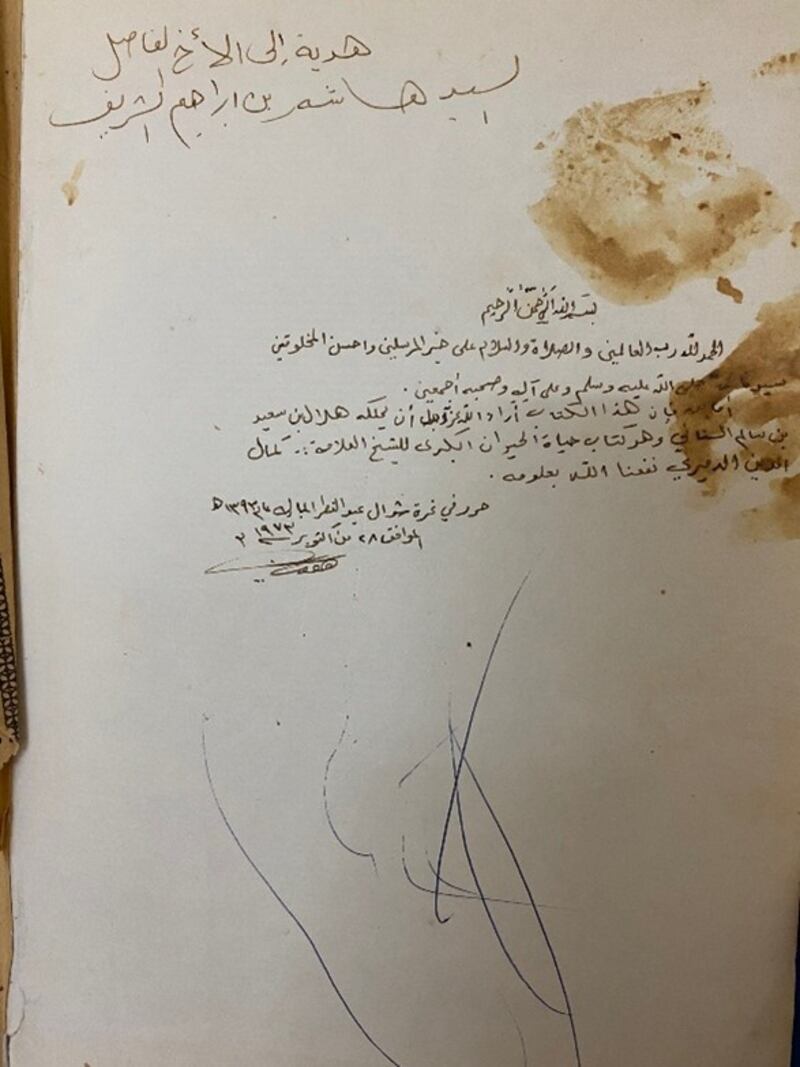 ومن ضمن الكتب التي اطّلعنا عليها كتابٌ يعود تاريخه إلى سنة 1331هـ، كان في حوزة النوخذة المرحوم راشد بن حمد بن محمد الغيلاني، وهو شاهدٌ إضافي على عناية نواخذة صور بالكتاب واقتنائه إلى جانب مهنتهم البحرية.