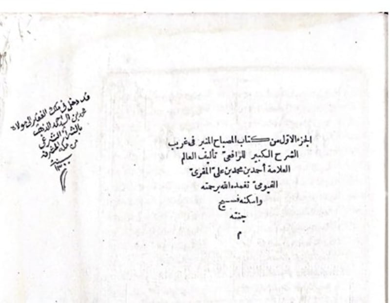 ومن بين هذه المقتنيات ما اشتراه القاضي السيّد محمد بن أحمد الذهب، ومنه الجزء الأول من كتاب “المصباح المنير في غريب الشرح الكبير للرافعي”، الذي اقتناه من مكة المكرمة في سنة 1300هـ، في دلالةٍ واضحة على وعيه بقيمة المراجع اللغوية والفقهية المطبوعة.
